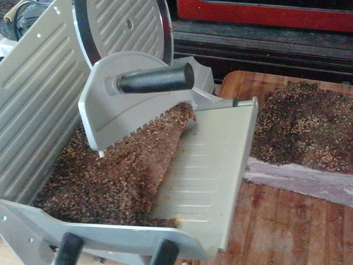 When the meat is cold, slice it as thinly as possible. I have a meat slicer, but if you don't, that's okay - use a good sharp slicing knife and make thin, uniform slices against the grain.